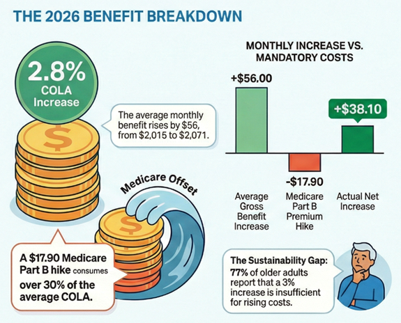 By now, you’ve received your notice from Social Security: benefits increased by 2.8% in January 2026. For the average retiree, that means about $56 more per month—raising the average benefit from $2,015 to $2,071.